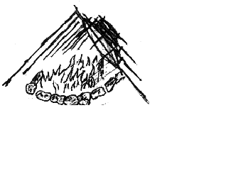 Salmon were cooked on fish racks placed at an angle over a trench of fire. --drawing by Brian Ward |